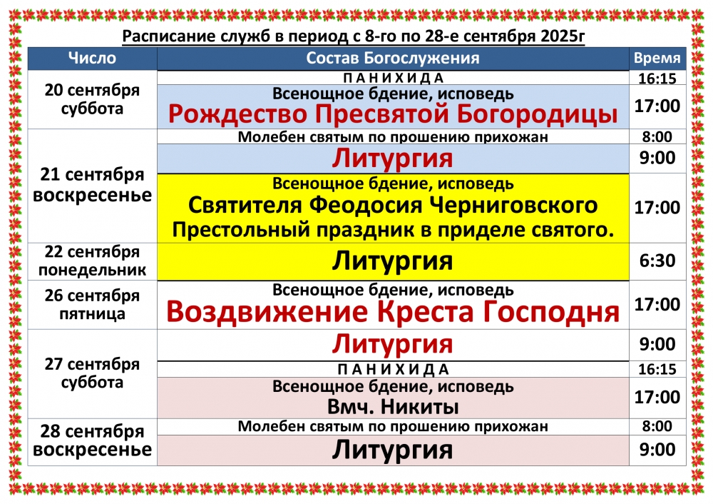 Расписание служб в период с 20-го по 28-е сентября 2025г ИЗМЕНИЛОСЬ !!!
