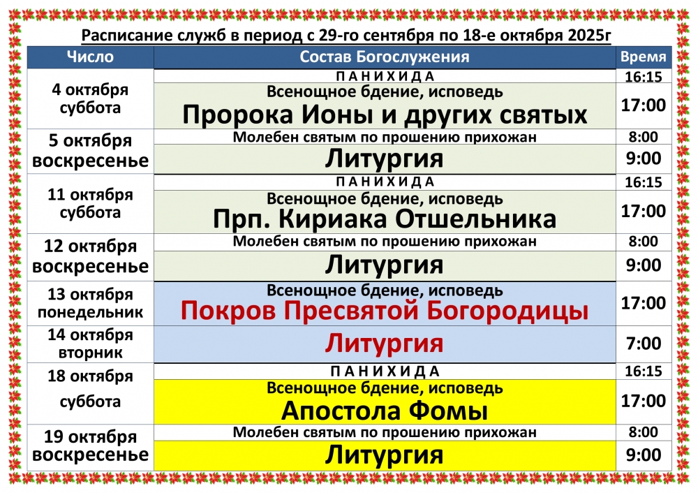 Расписание служб в период с 29-го сентября по 18-е октября 2025г