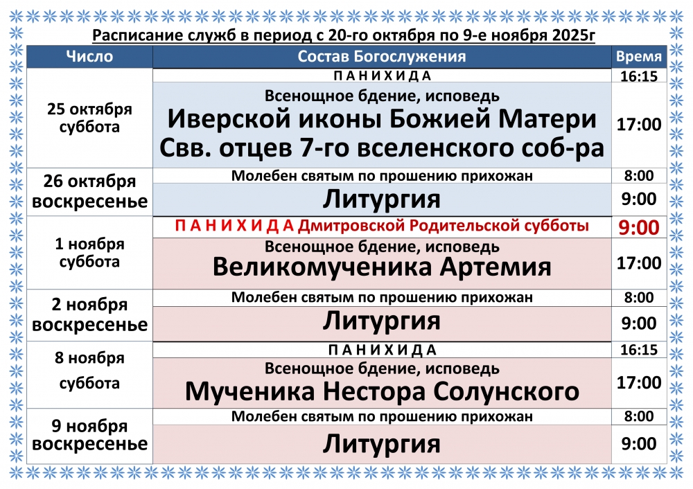 Расписание служб в период с 20-го октября по 9-е ноября 2025г
