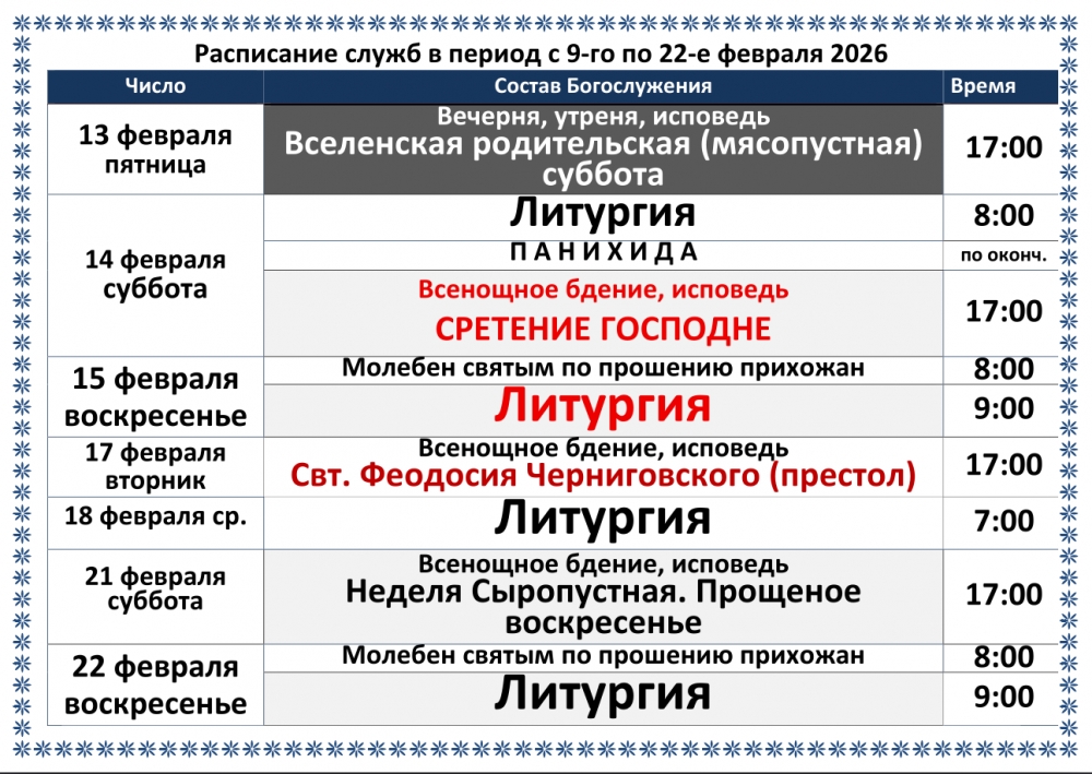 Храм Святого Духа - Расписание служб в период с 9-го по 22-е февраля 2026. Сретение. Престол святителя Феодосия Черниговского