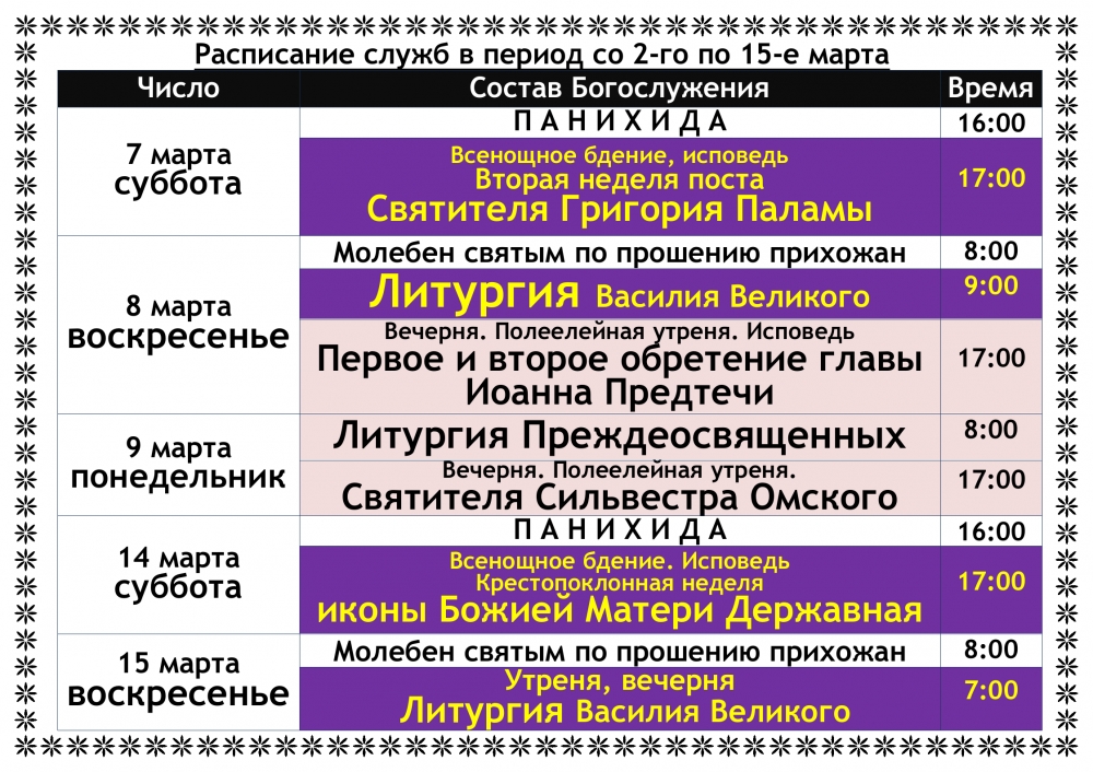Расписание служб в период сo 2-го по 15-е марта