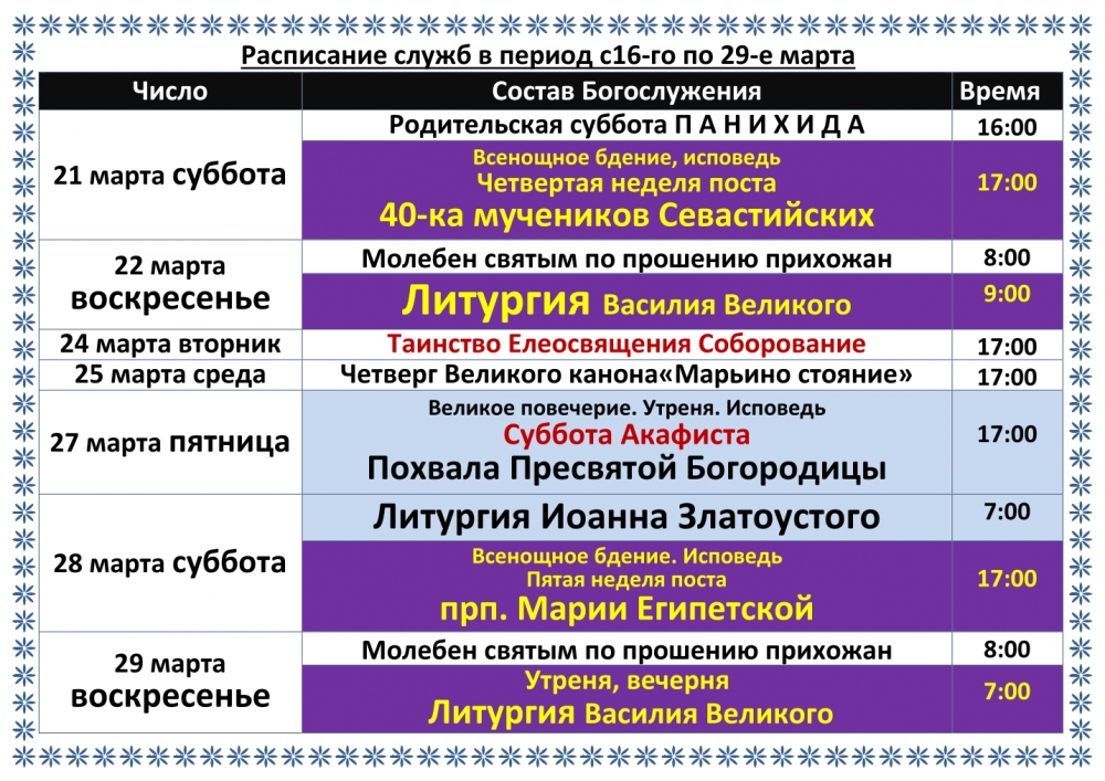 Расписание служб в период с16-го по 29-е марта 2026. Соборование
