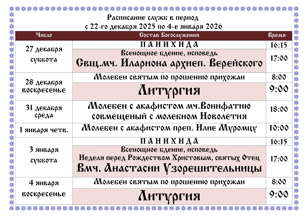 Расписание служб в период с 22-го декабря по 4-е января