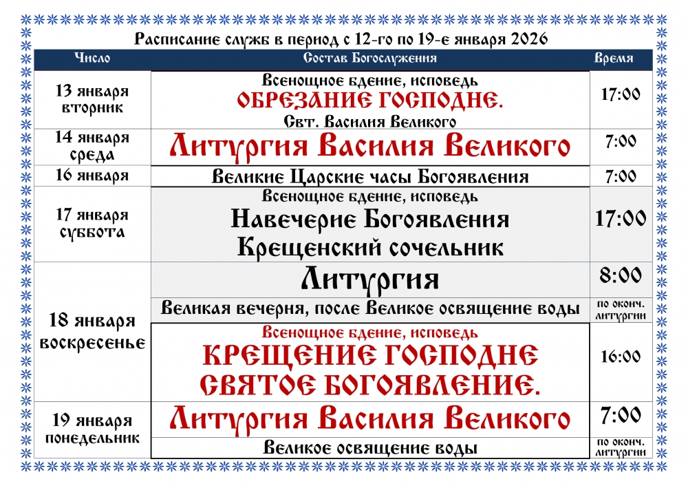 Расписание служб в период с 12-го по 19-е января 2026 Богоявление